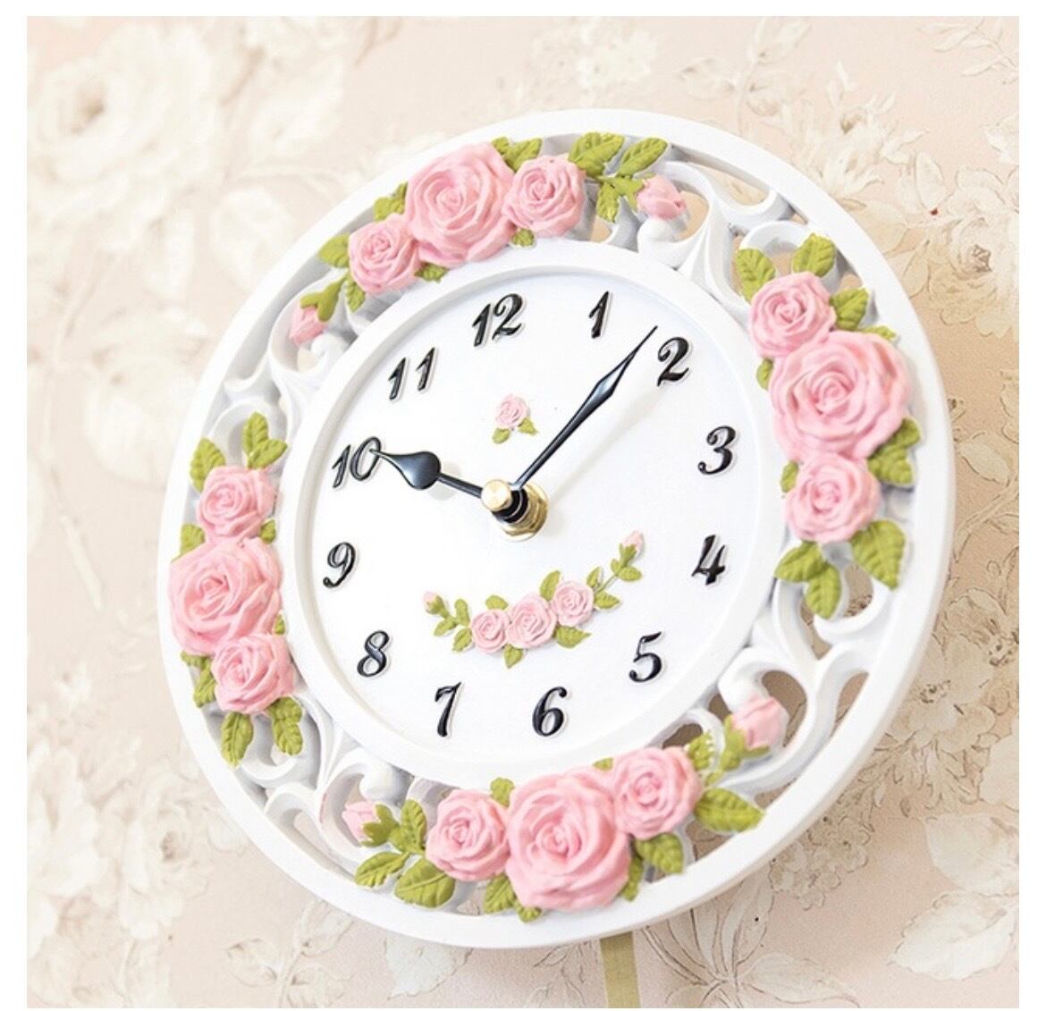 真っ白なラウンド型の時計に、ピンクのバラが咲き誇るデザイン。
