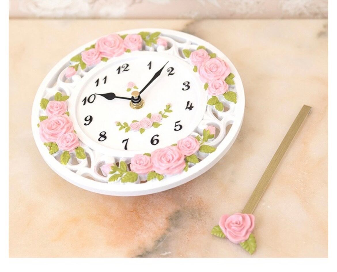 振り子の先にも小さなバラが揺れ、まるで花が時を刻むような愛らしさ。