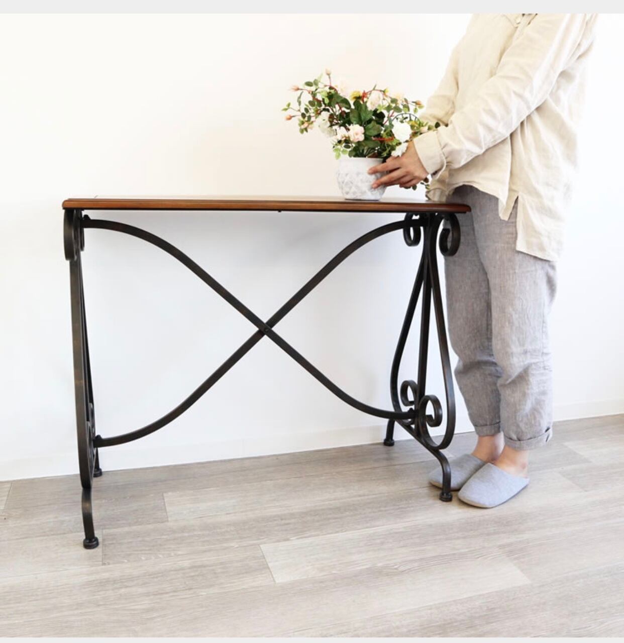 アンティーク調のアイアンにウッドの天板がとても個性的なデザインのコンソール